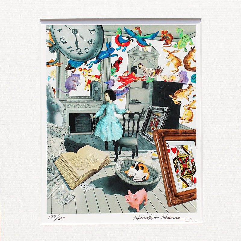 Alice in Swirling World of Wonderland by Hiroko Hanna, a renowned Japanese artist. In this picture Alice is standing amidst a swirling world of Wonderland animals and objects.