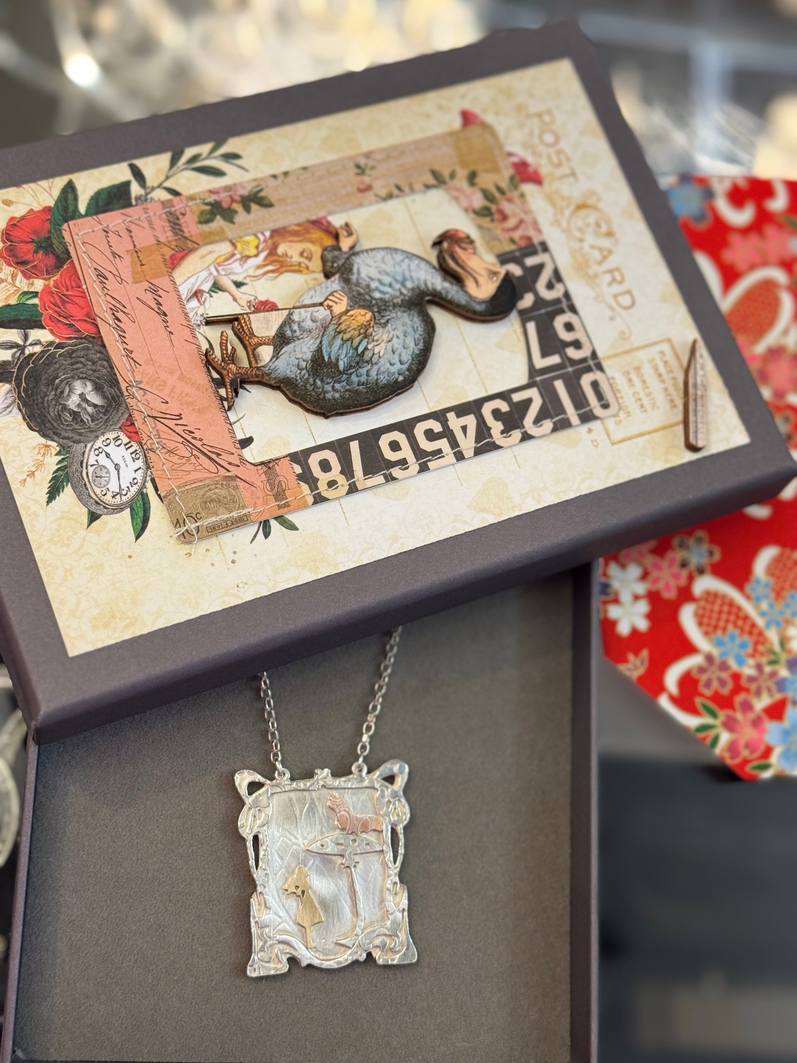 Exquisite individually hand-crafted pendant necklace with Alice and caterpillar in Sterling Silver. Each character is individually produced so minor variations may exist. Includes presentation box which may vary in design.