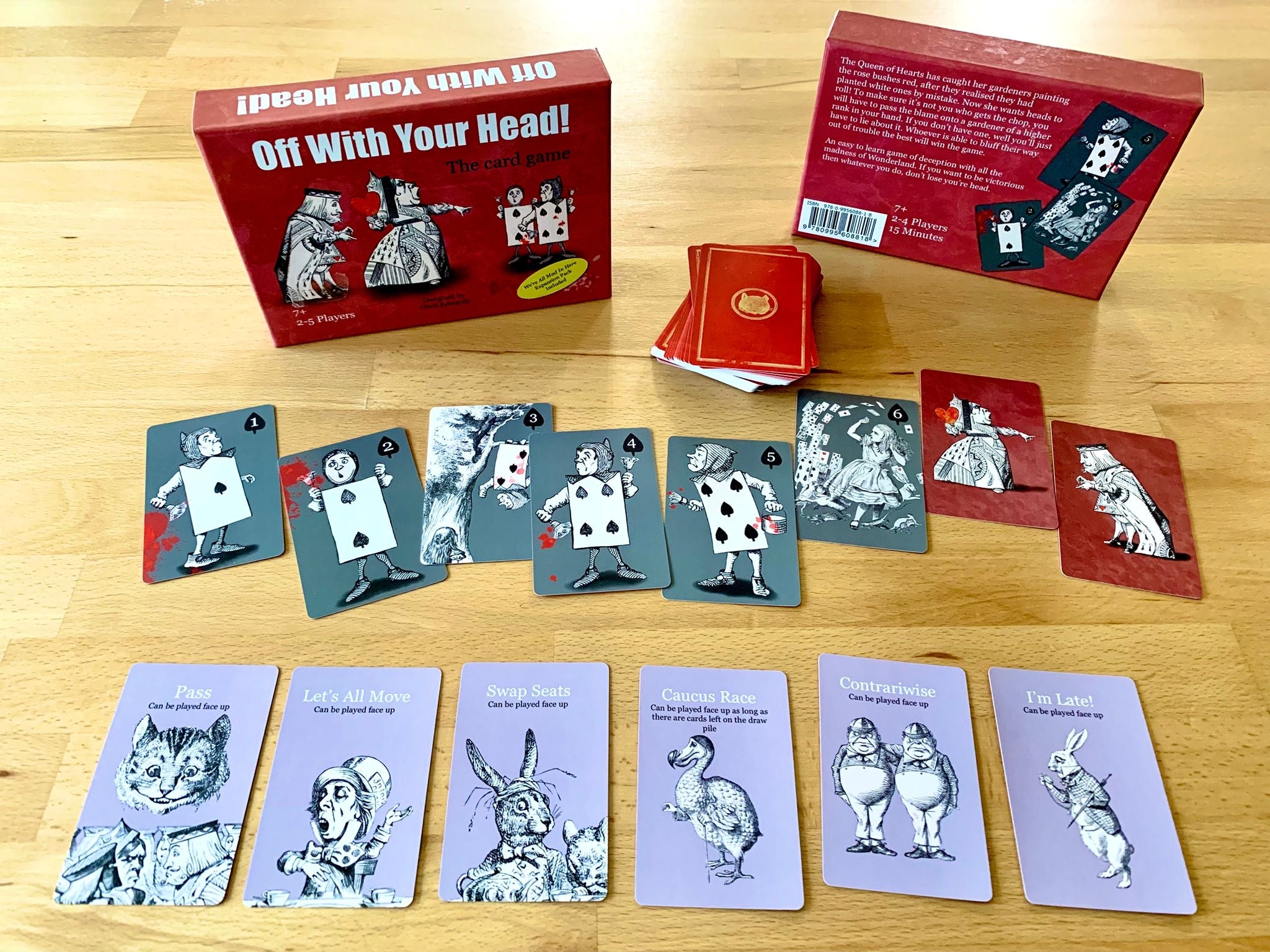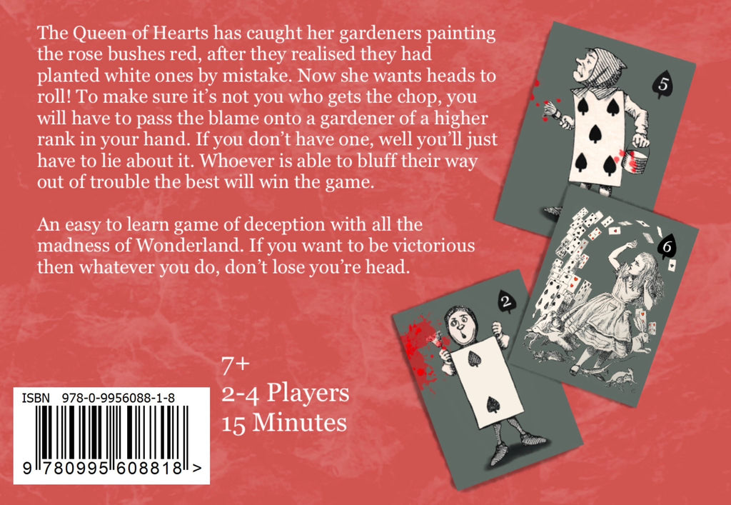 The Queen of Hearts has caught her gardeners painting the rose bushes red, after they realised that they had planted white ones by mistake. Now she wants heads to roll! To make sure that it’s not you who gets the chop, then you will have to pass the blame onto a gardener of a higher rank in your hand. If you don’t have one, well you’ll just have to lie about it. Whoever is able to bluff their way out of trouble the best will win the game.