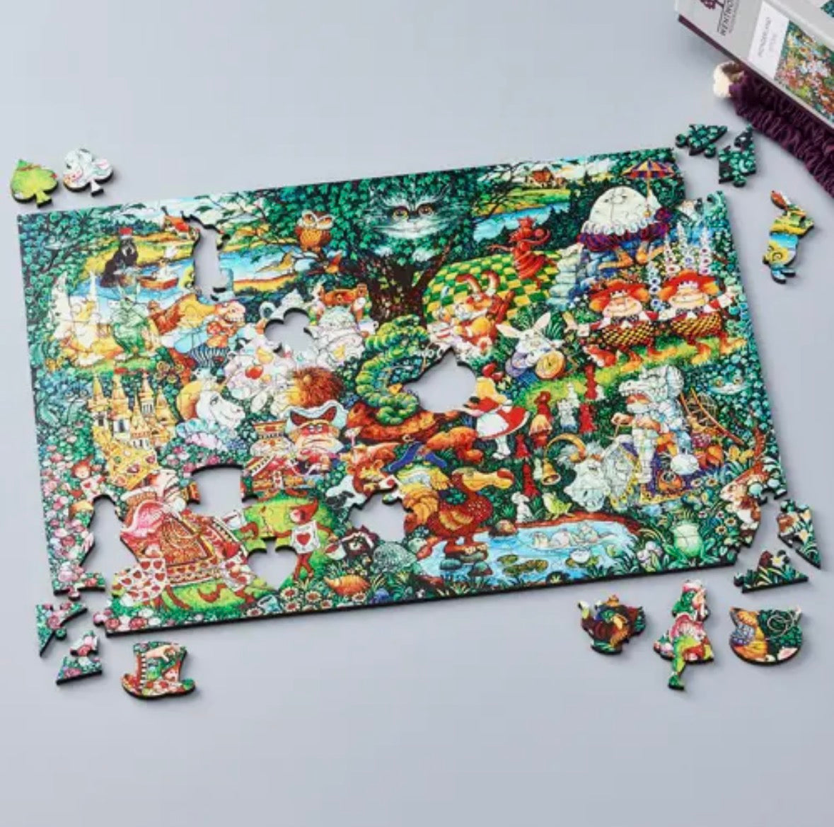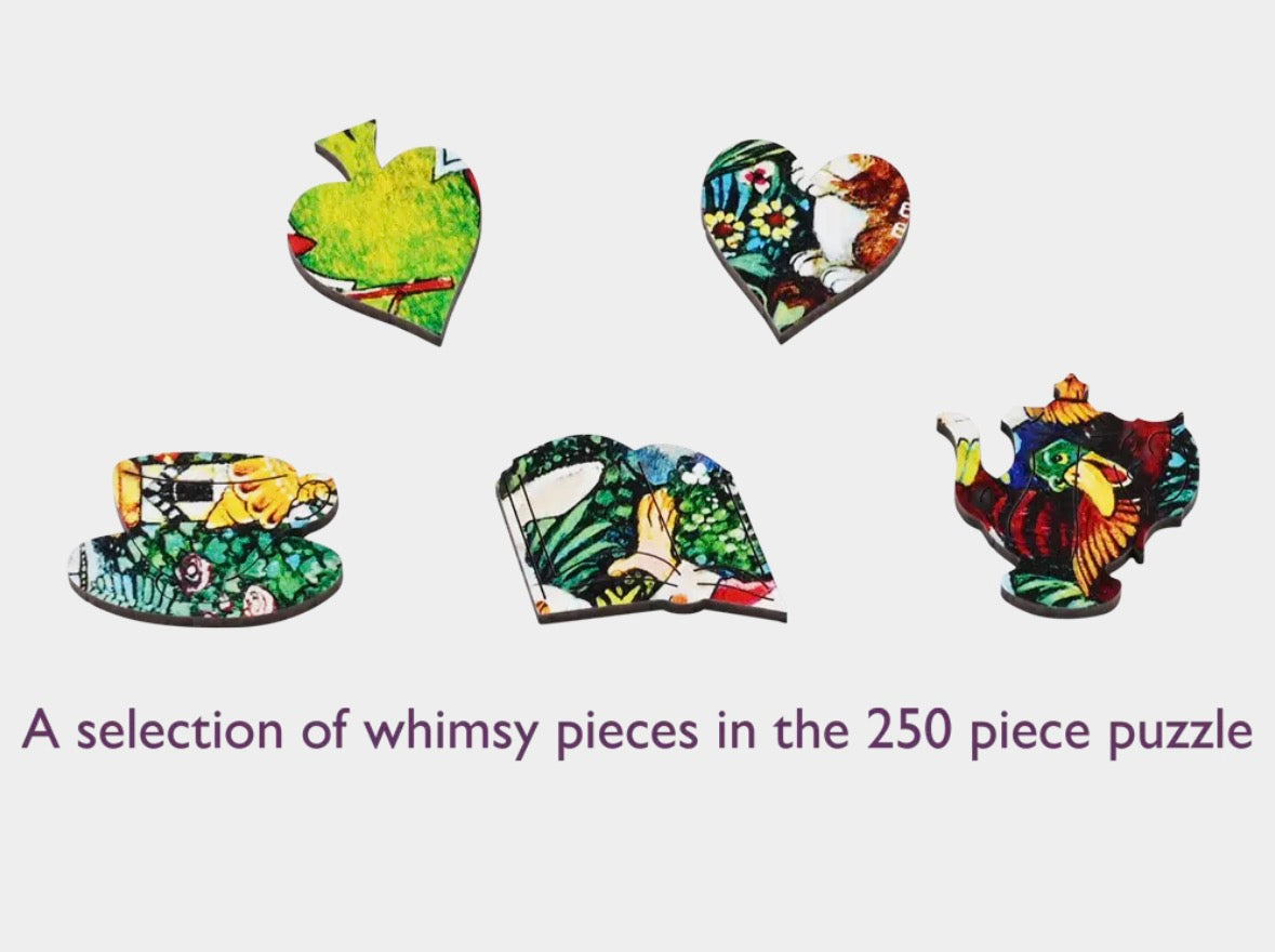 Be transported to a wonderland of your own with themed whimsies and this exclusive Alice in Wonderland-inspired artwork by Michelle Carlos. This bespoke puzzle image is bustling with details from the original tale, including the Cheshire Cat, Mock Turtle, and Queen of Hearts. Find your favourite characters cleverly reflected in the themed whimsies of this magical wooden puzzle for adults.